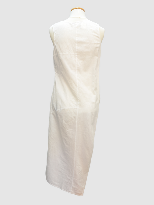 Weiß-beiges Blusen-Midikleid mit breitem grünen Gürtel von Sara Roka