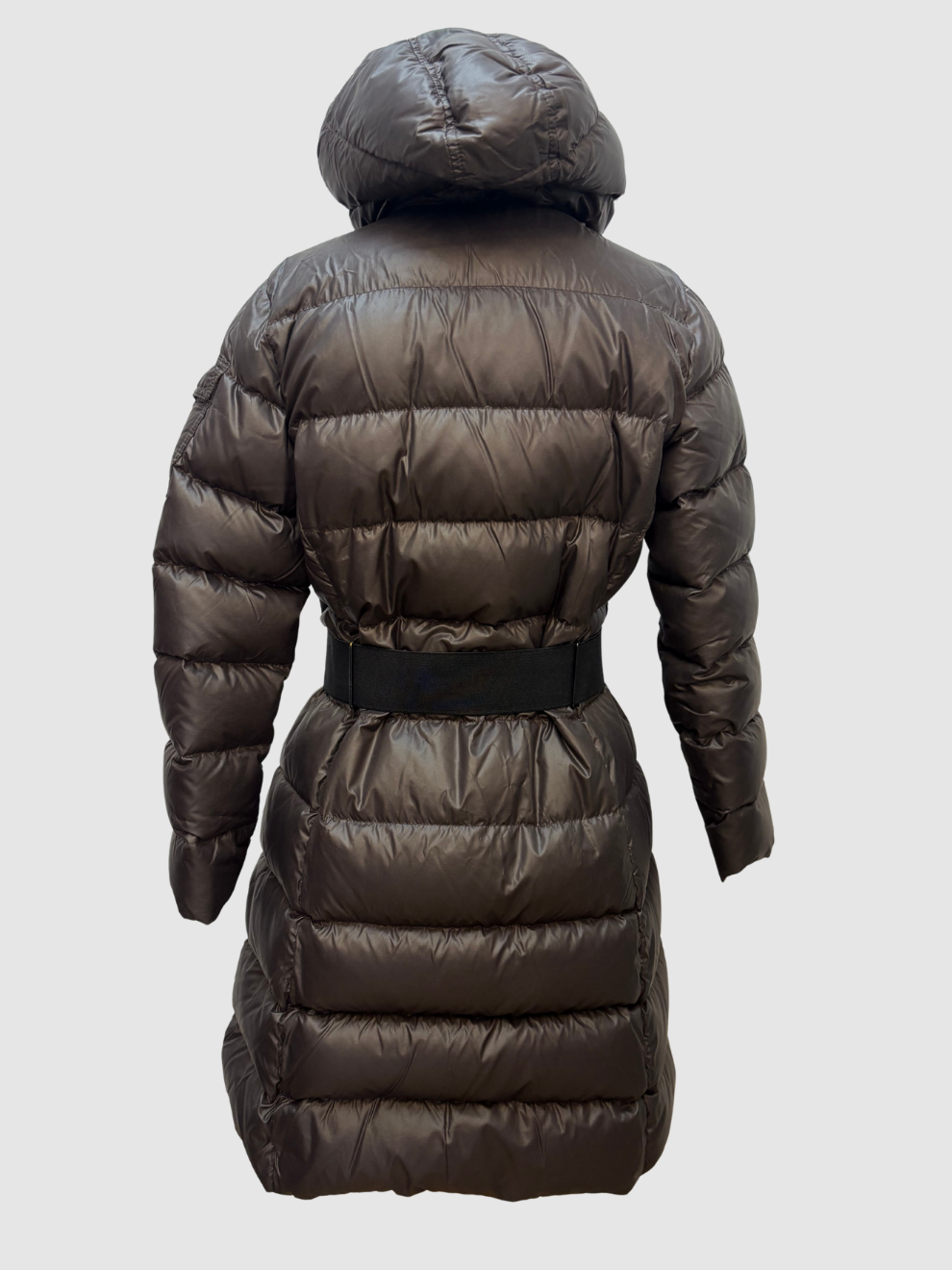 Dunkelbrauner Mantel mit schwarzem stretchy Gürtel und abnehmbarer Kapuze von Moncler. Reißverschlusstaschen, mit Reißverschluss zu schließen, Daunen-Futter. Guter, getragener Zustand. Größe: 2 (entspricht etwa einer D 36, FR 38)