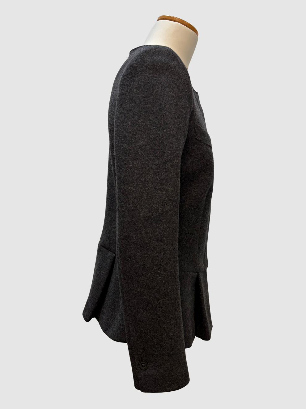 Dunkelgraue Blazer-Jacke aus Wolle mit Schößchen von Isabel Marant. Kurz geschnitten, rundem Halsausschnitt mit kleinem Schößchen, Brusttasche und mit Haken vorne zu schließen. Sehr guter Zustand. Größe: 38 (FR 40)