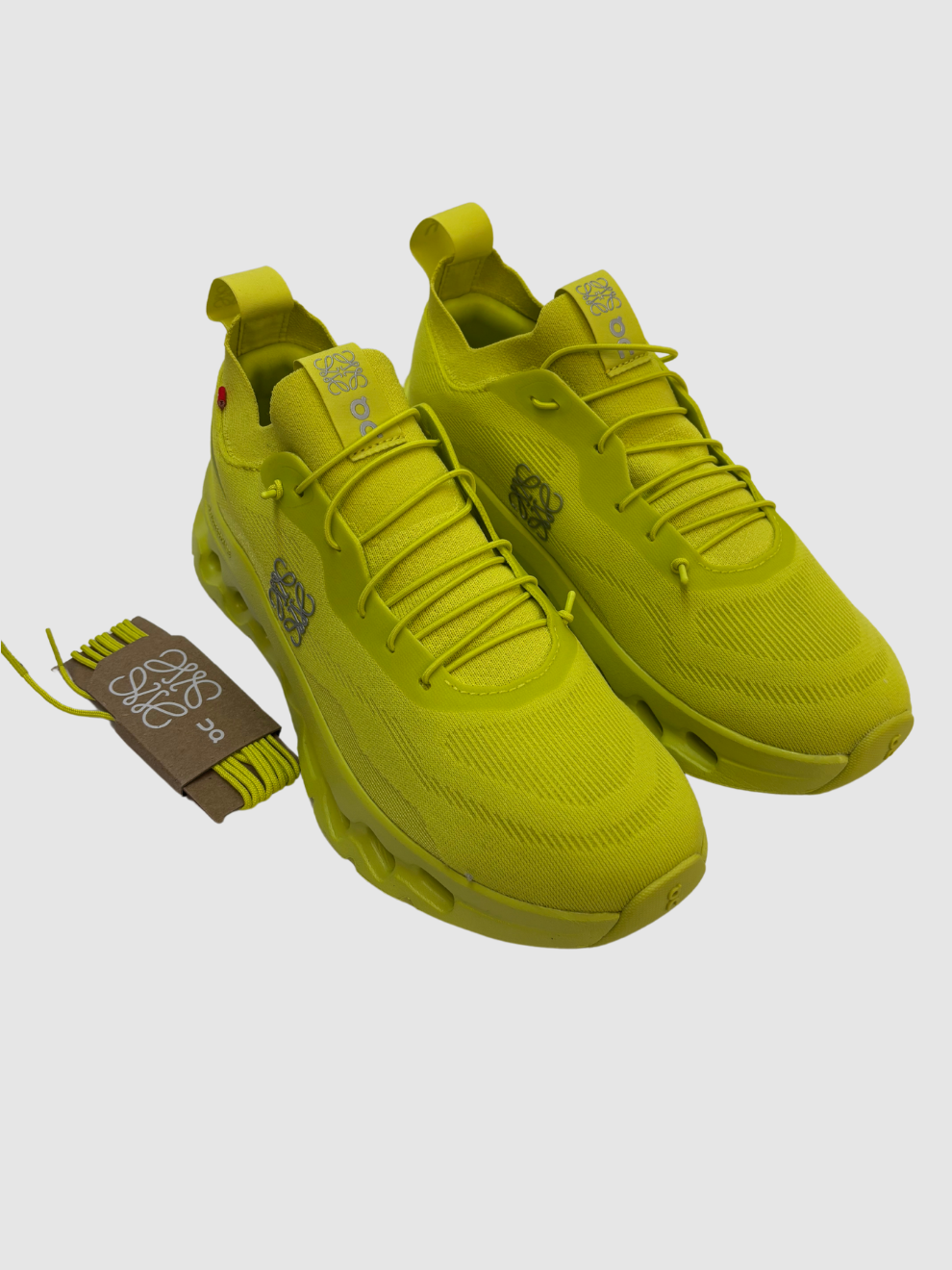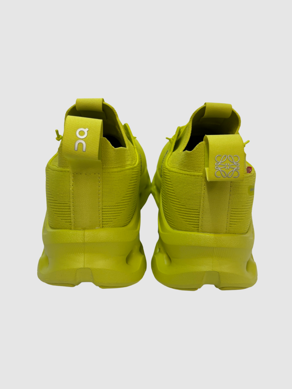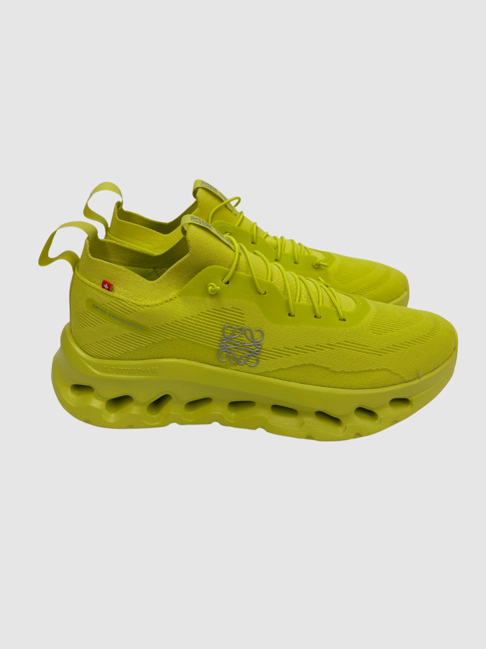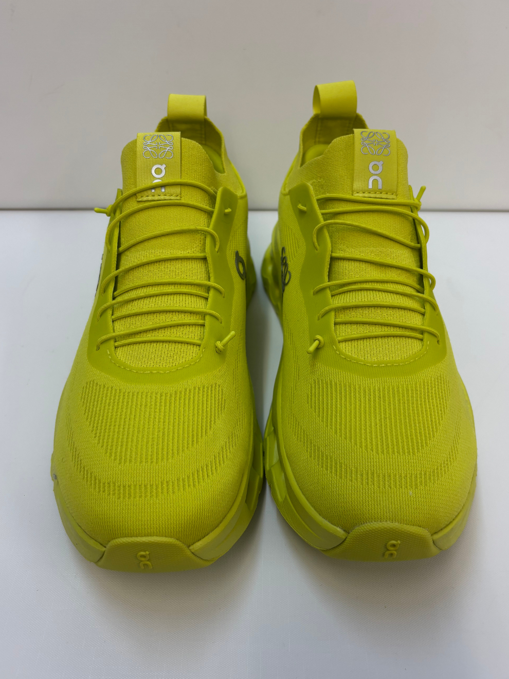 Giftgrüner leichter Sneaker von Loewe x On: aus recyceltem Polyester mit CloudTec Phase Technologie. Socke aus gestricktem Mesh, hohe Sohle aus Schaumstoff, Schnürung mit extra Paar Schnürsenkeln, Schlaufe hinten. Silbernes Loewe sowie On Logo seitlich am Schuh. Ungetragen. Größe: 40