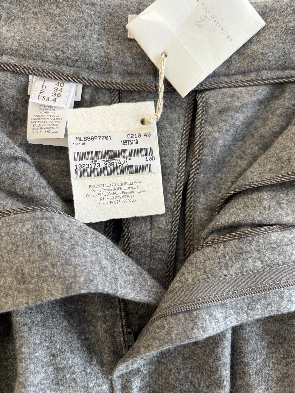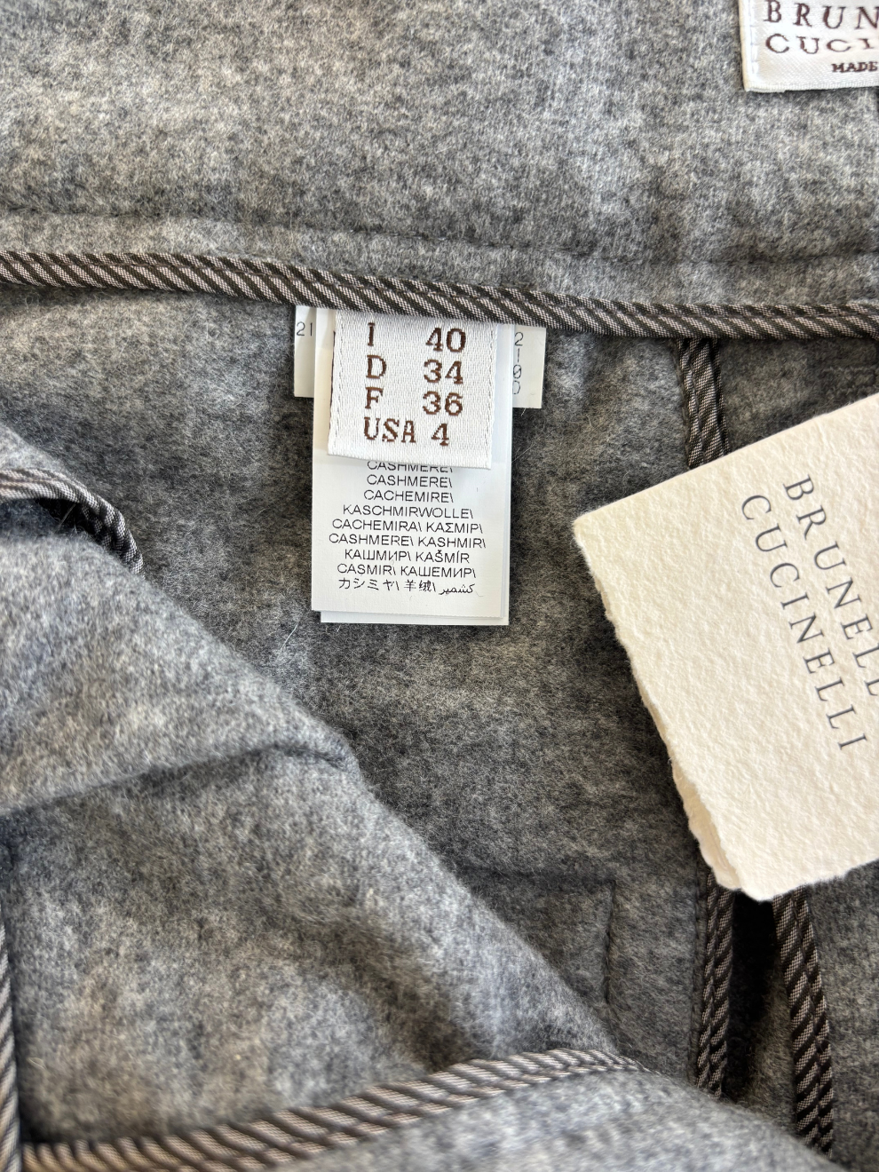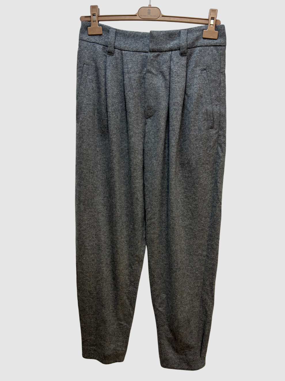 Graue Anzughose aus 100% Kaschmir von Brunello Cucinello. Weites Bein, unten schmal zulaufend. Eingrifftaschen, Gürtelschlaufen.