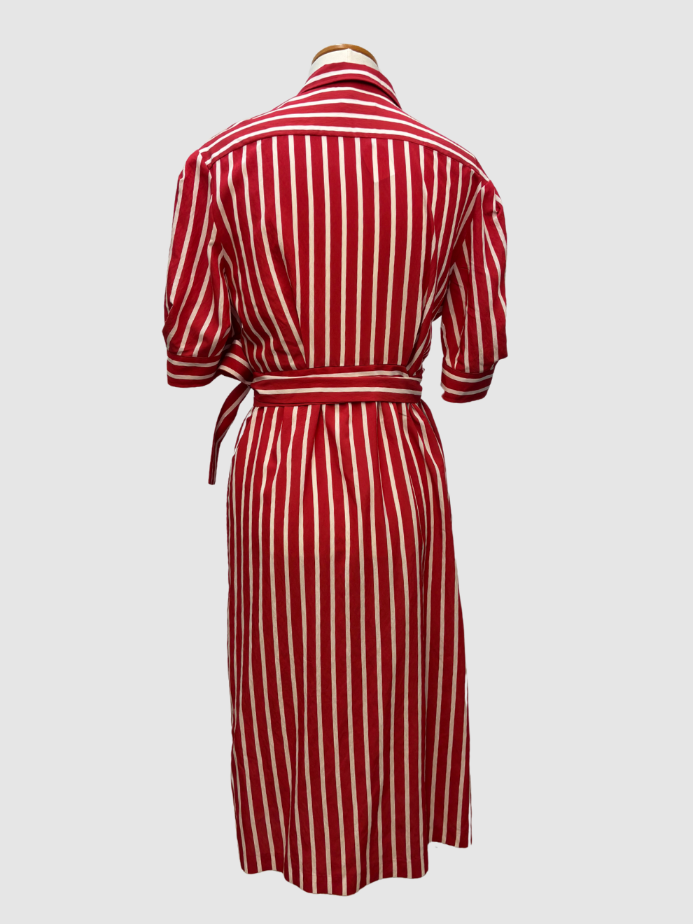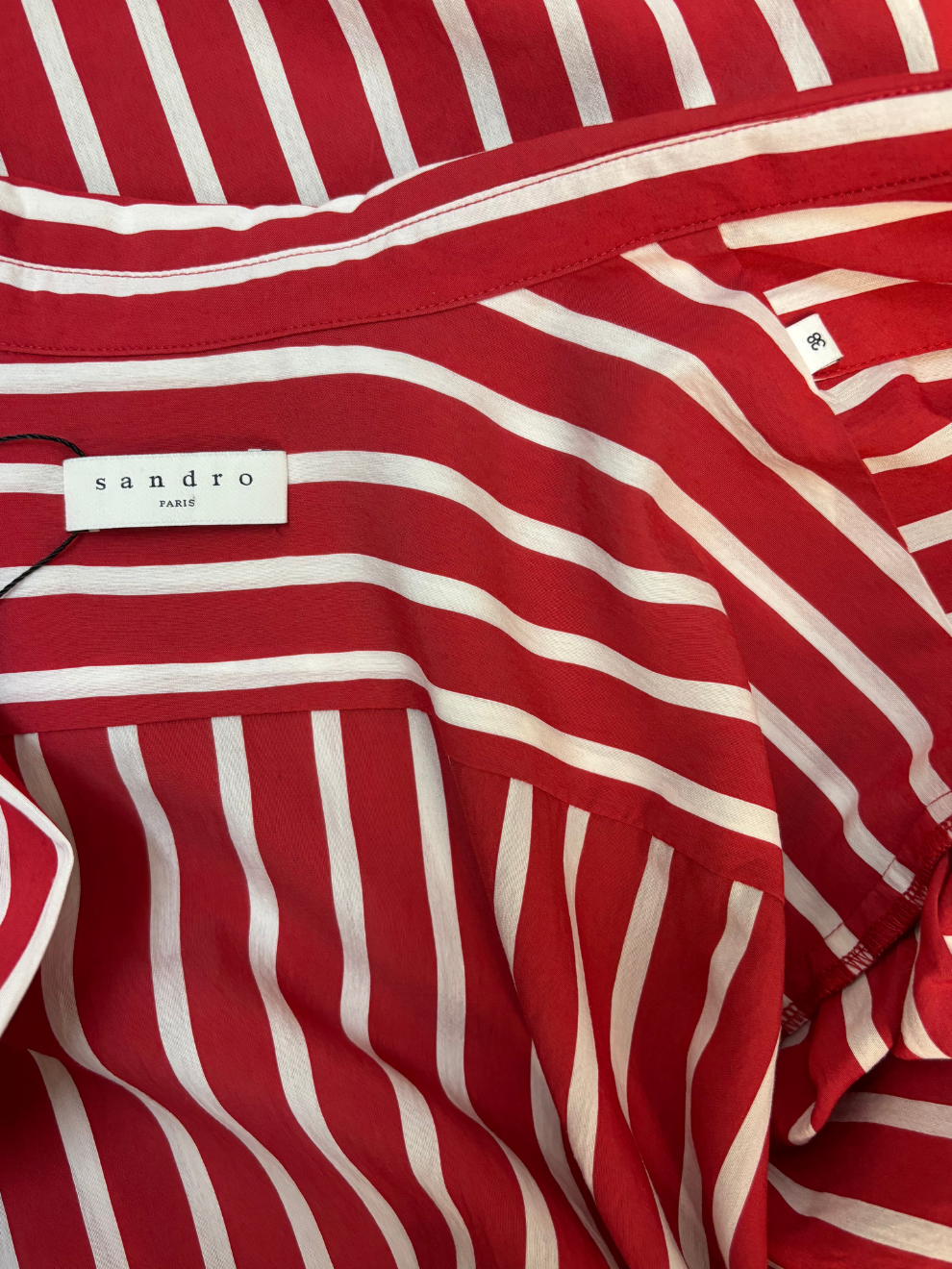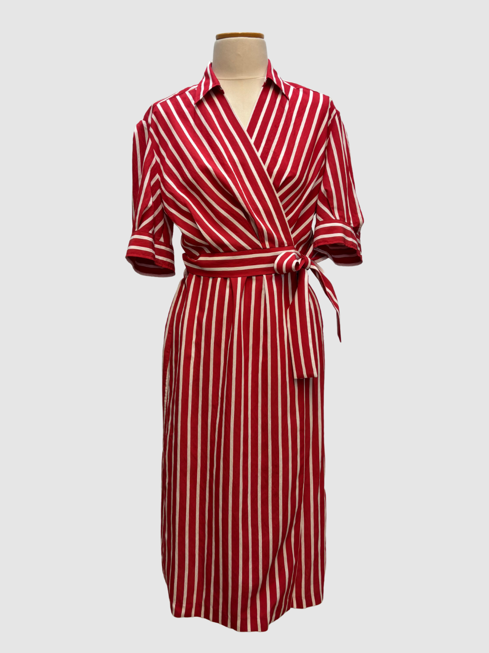 Rot-weiß gestreiftes Wickelkleid im Blusenstil von Sandro. Kurze Ärmel, Blusenkragen, Midilänge. Sehr guter Zustand. Größe: 38