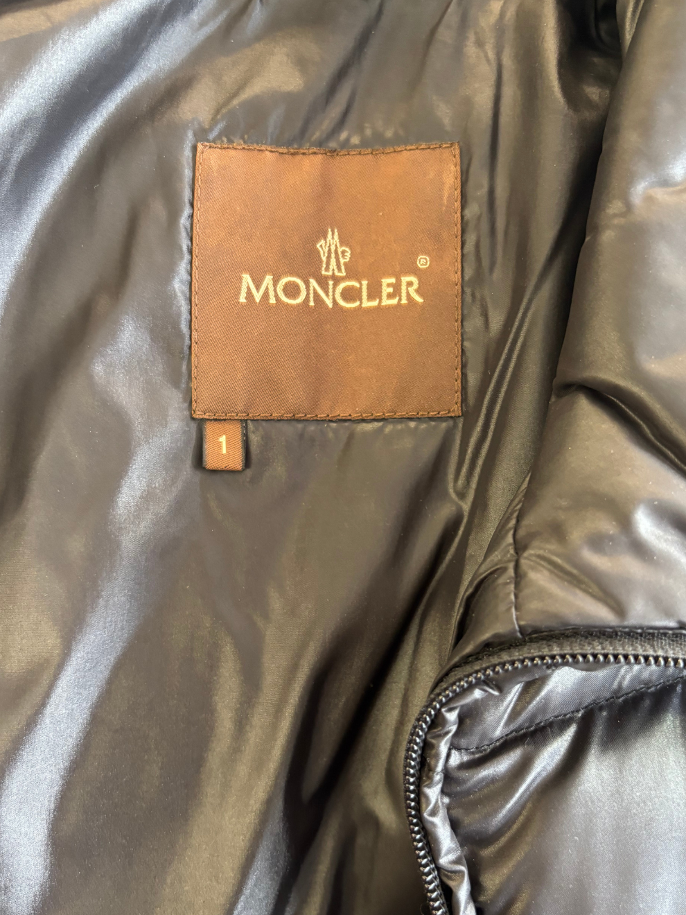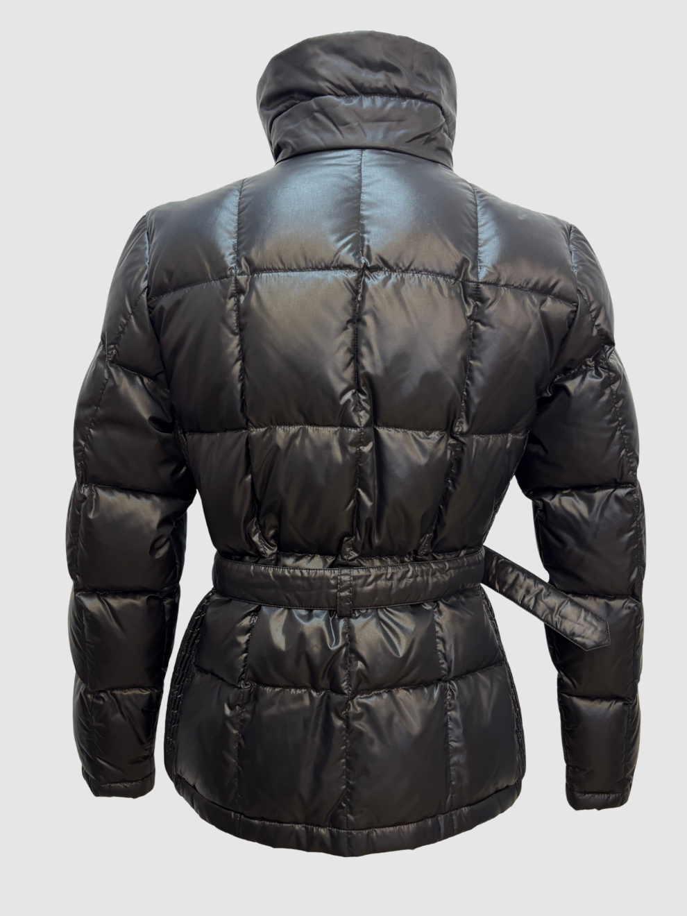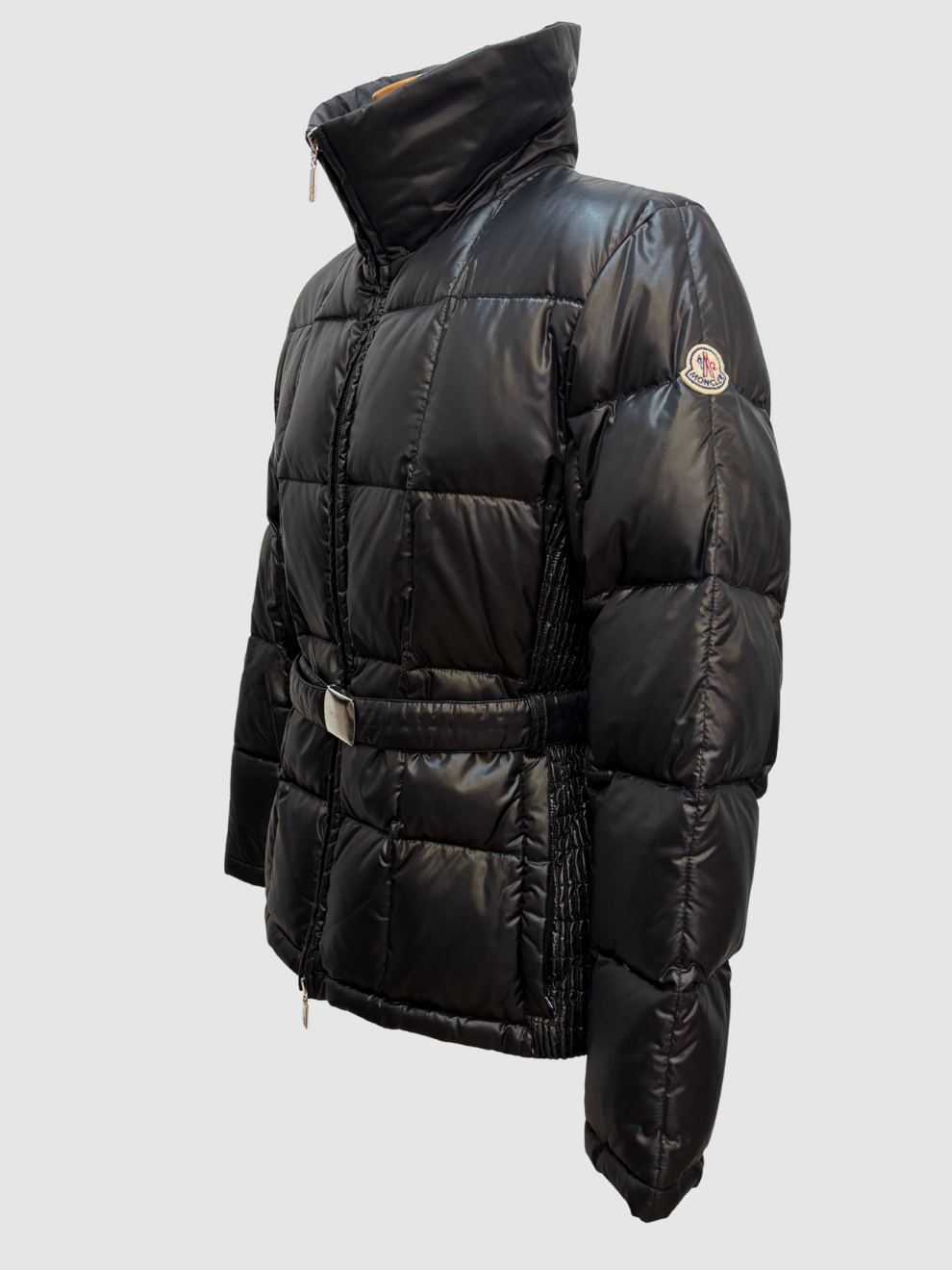 Schwarze Daunenjacke von Moncler mit Gürtel und silberfarbener Schnalle mit Logogravur, hohem Kragen, Reißverschluss sowie zwei Eingrifftaschen mit Reißverschluss. Moncler-Logoaufnäher auf Schulter. Sehr guter Zustand. Größe: 1 (D etwa 34/36)