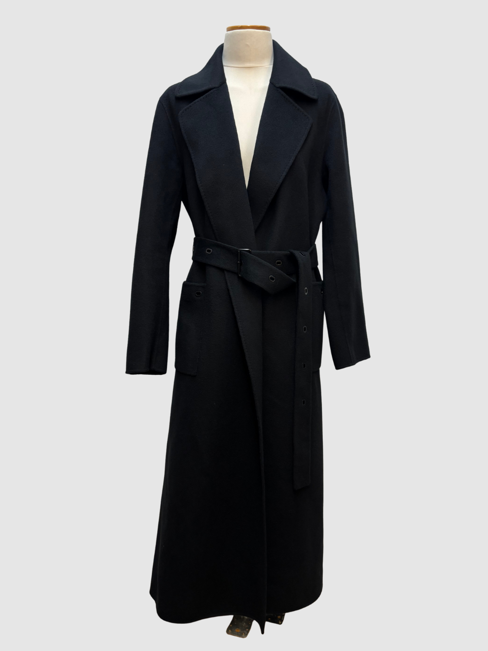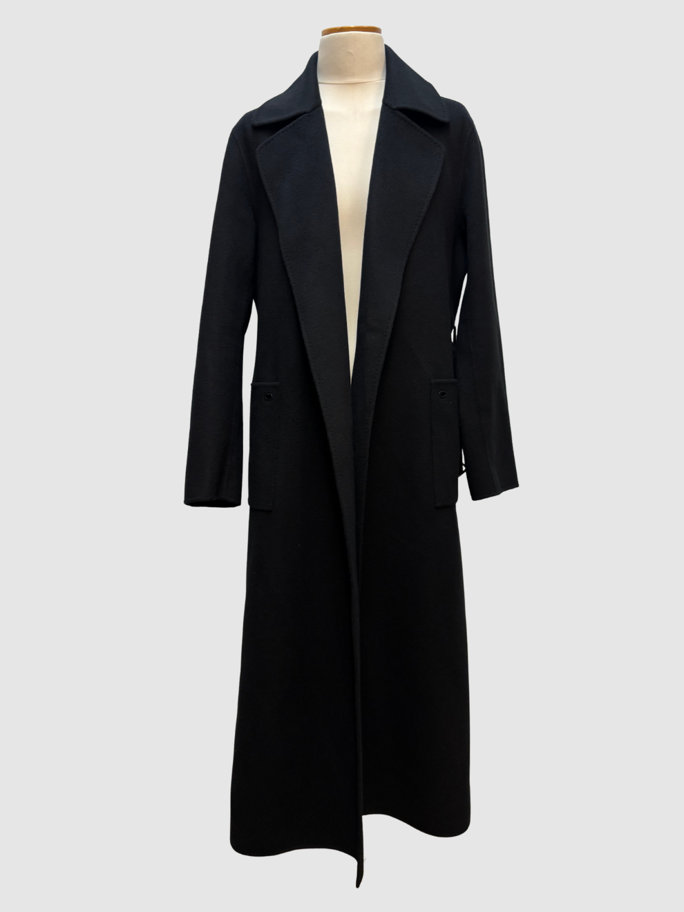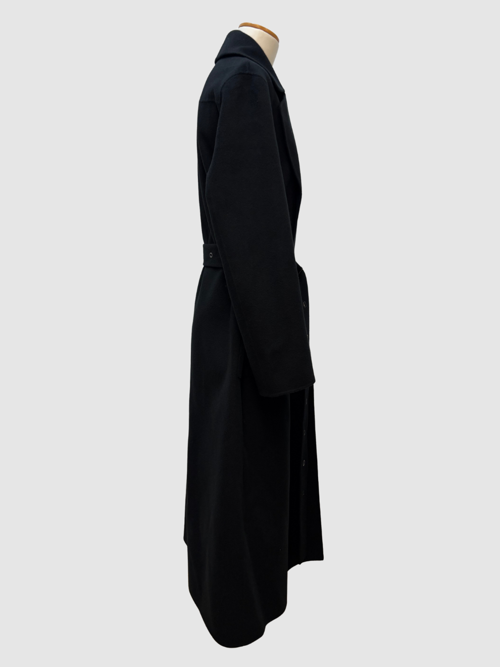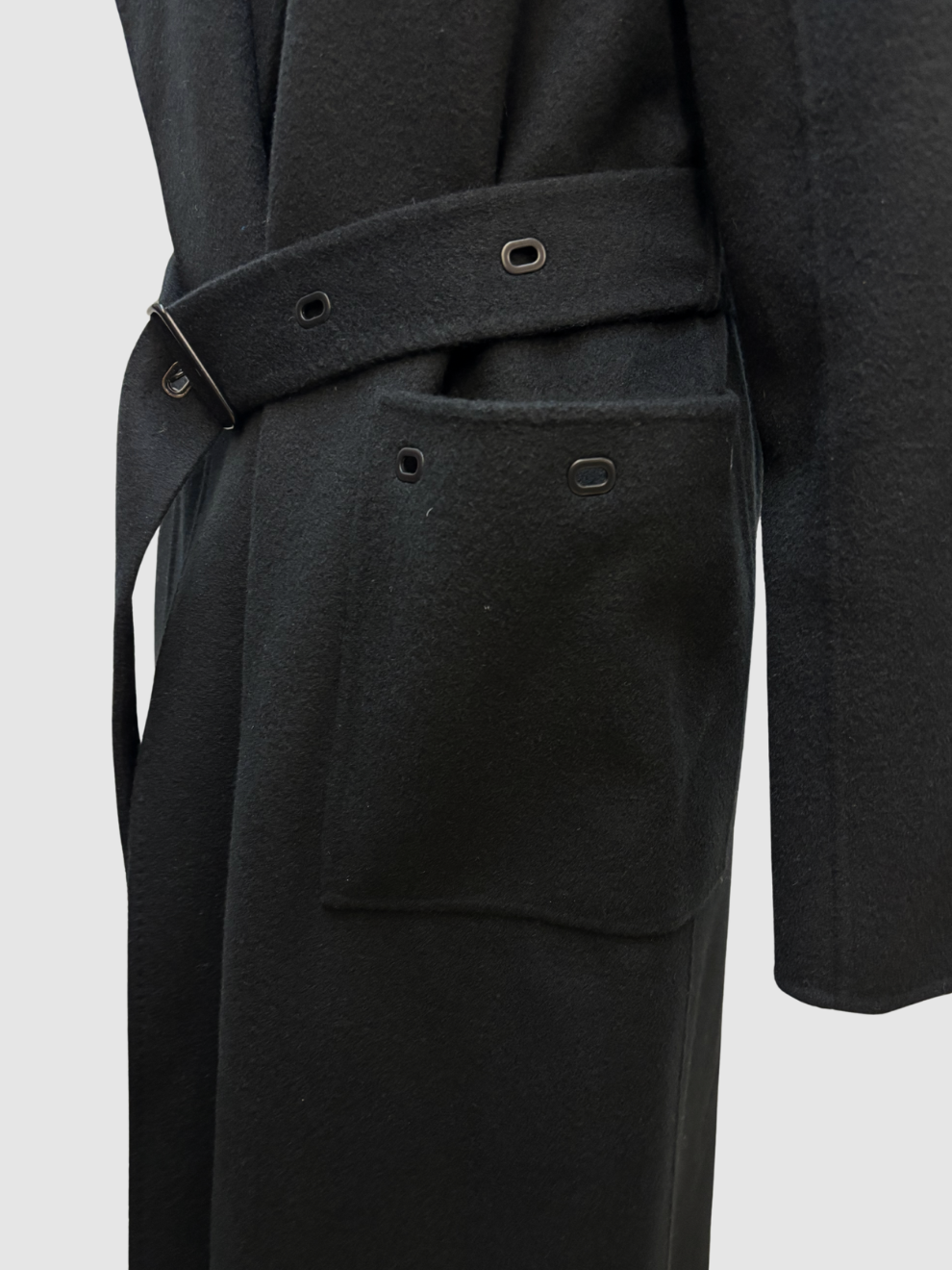 Schwarzer, langer Mantel aus Kaschmir von Iris von Arnim. Mit Reverskragen, Bindegürtel mit schwarzen Loch-Nieten, aufgesetzte Taschen, lockere Silhouette. Sehr guter Zustand.