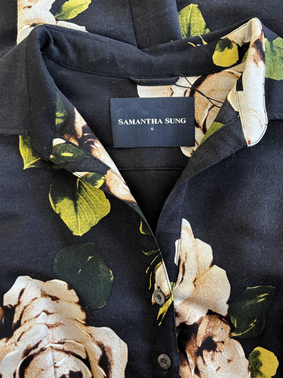 Schwarzes Blusenkleid mit beige-weißem Rosenprint von Samantha Sung. Verkürzte Ärmel, Blusenkragen, Gürtel zum Taillieren, nicht bis ganz oben zu schließen, Eingrifftaschen seitlich. Mit einem Reißverschluss seitlich zu öffnen. Größe: US 6 (entspricht laut Size Chart einer D 38). Sehr guter Zustand.