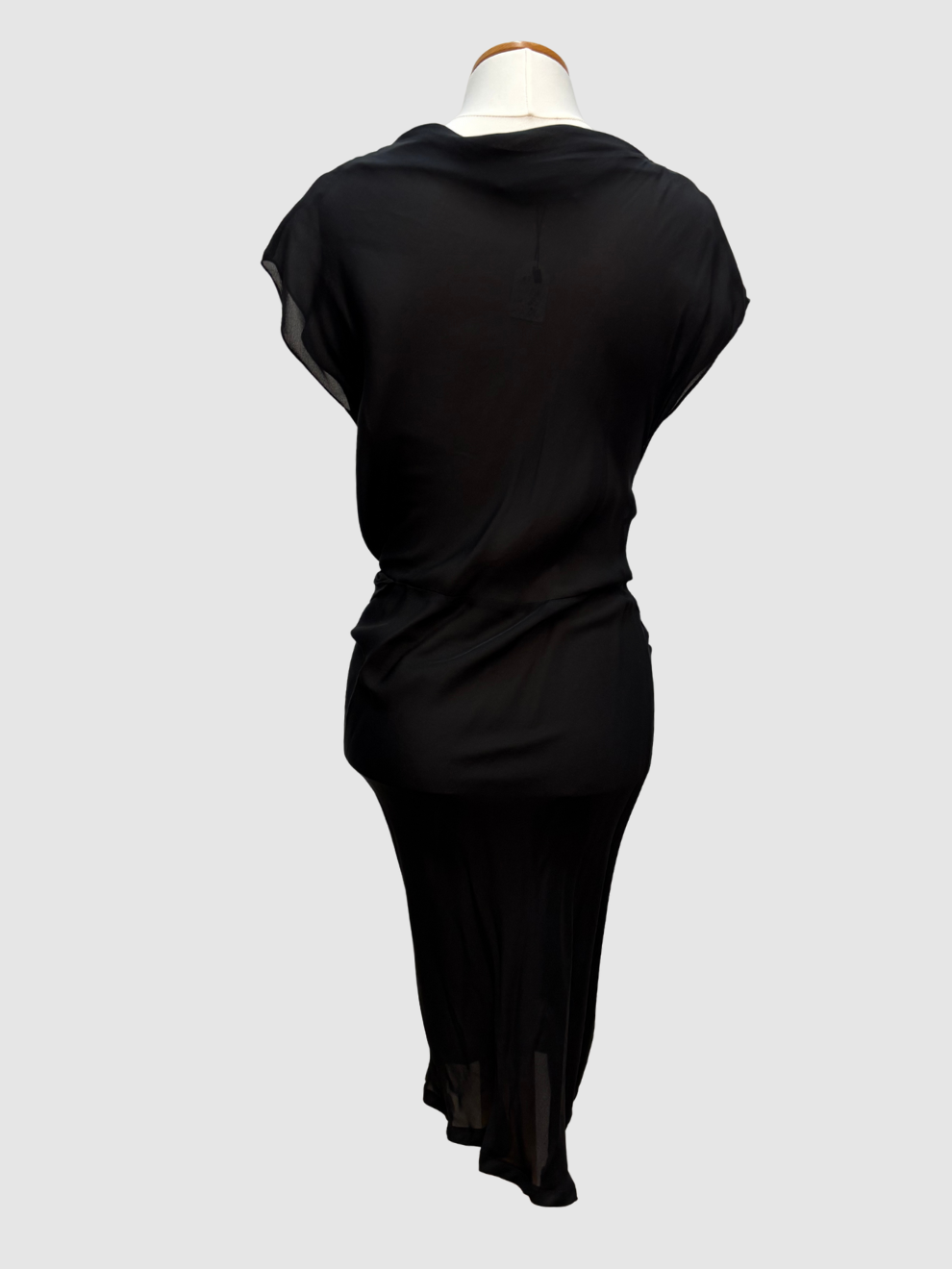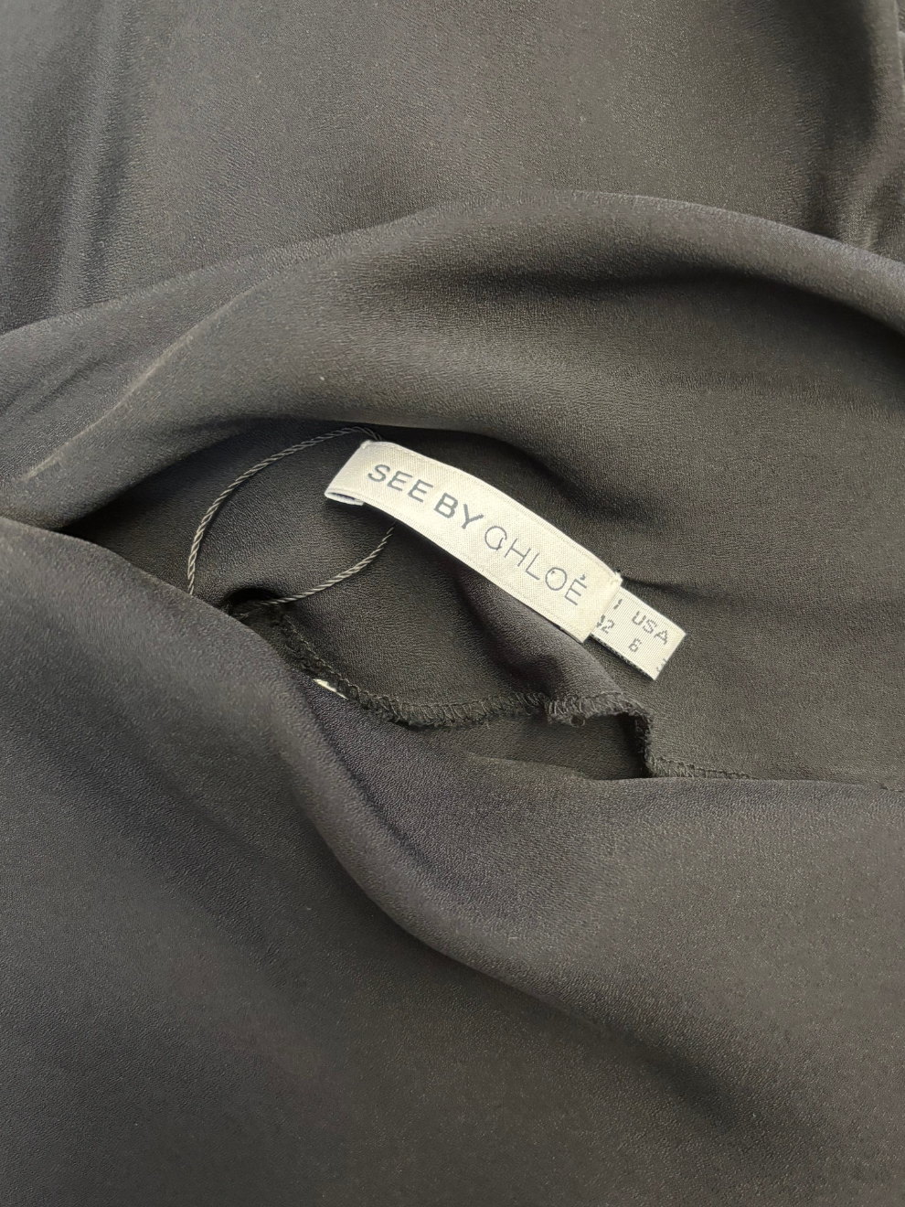 Schwarzes semitransparentes Kleid mit seitlicher Raffung an der Hüfte von See by Chloé. Kleiner Wasserfallausschnitt, leicht transparent, Rock in mehreren Lagen mit kleinem Gehschlitz vorne, kleine Ärmelchen. Sehr guter Zustand. Größe: 38