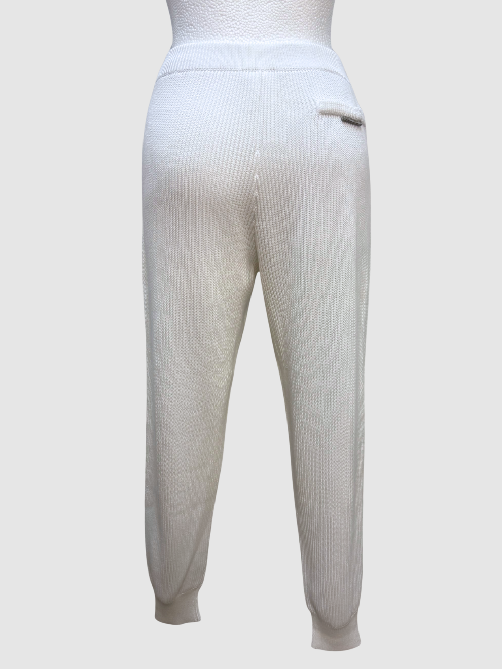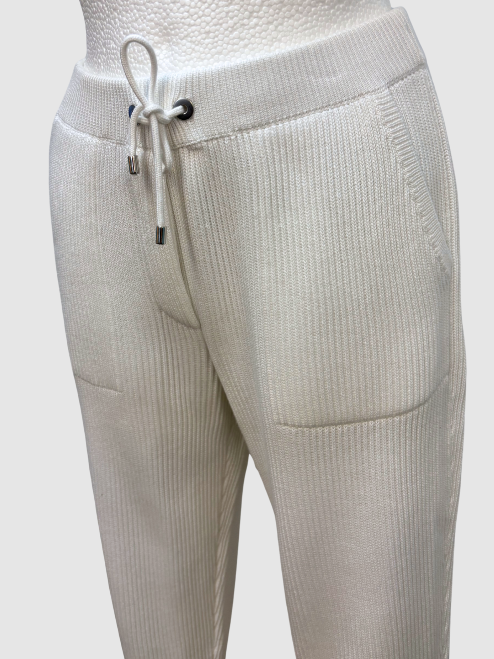 Weiße Rippstrick-Hose von Brunello Cucinelli mit elaistischem Gummibund, Jogginghosen-typischer Kordel, Rippbündchen, seitliche vorne aufgesetzten Taschen sowie typischer Glitzerembroidery an der Gesäßtasche. Sehr guter Zustand. Größe: S