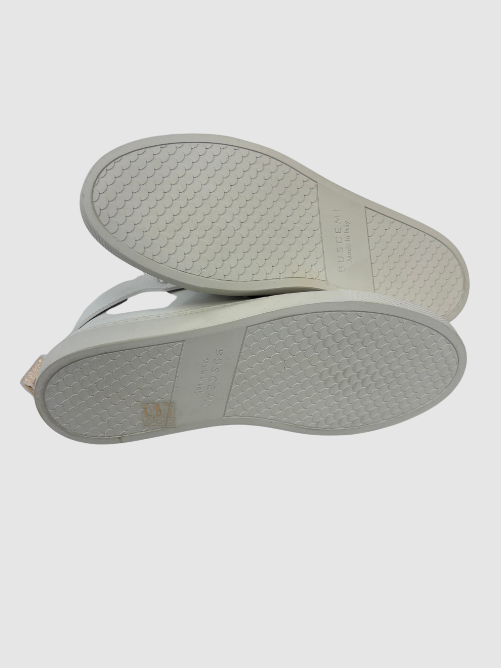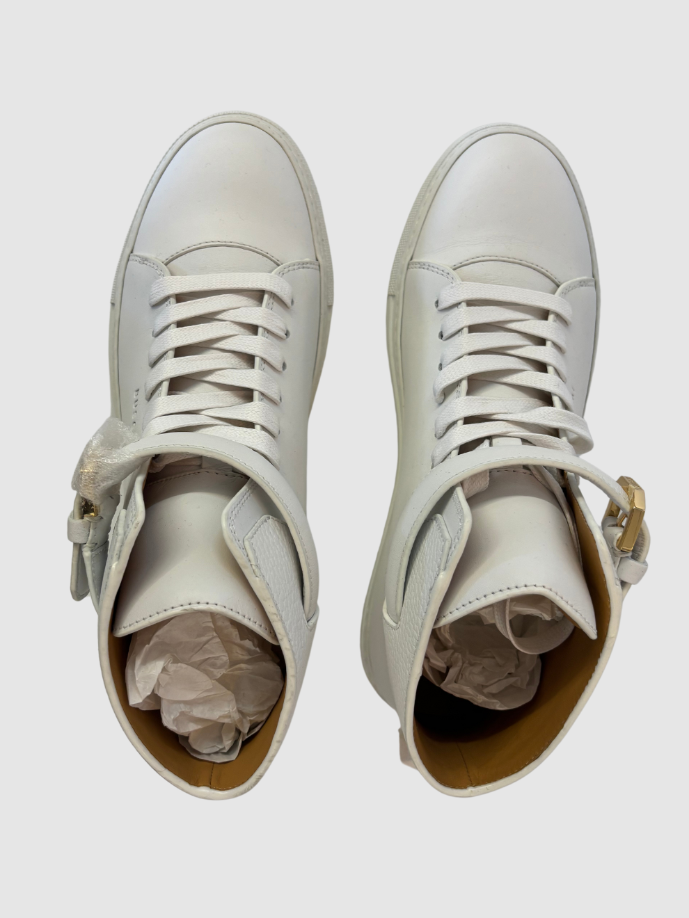Weißer hoher Sneaker aus glattem Leder von Buscemi. Der Hightop-Sneaker verfügt über das ikonische goldene Schloss sowie eine Schnalle mit goldener Schließe vorne an der Zunge. Sehr guter, ungetragener Zustand. Größe: 39